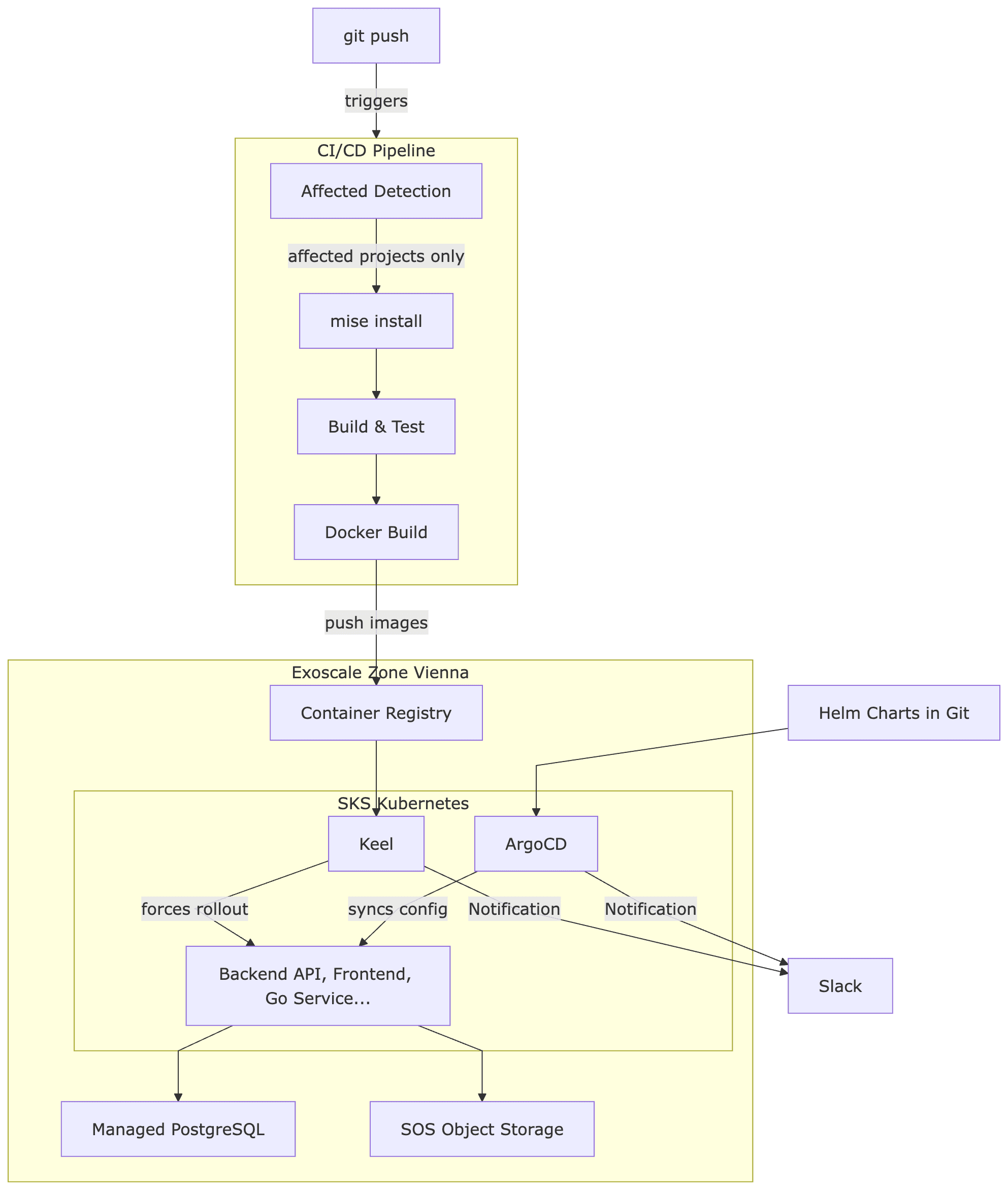Vollständig europäisch souverän – vom Pulumi State über die Container Registry bis zur Datenbank läuft alles auf Exoscale in Wien. Kein Datenpunkt verlässt den europäischen Rechtsraum.